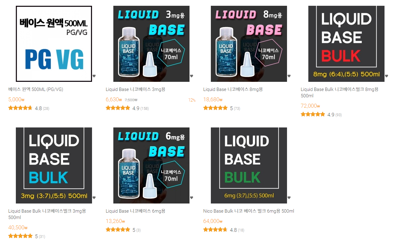 리퀴드 매니아는 완성형 액상만 판매하는 뿐만 아니라 니코 베이스랑 향료도 있습니다.