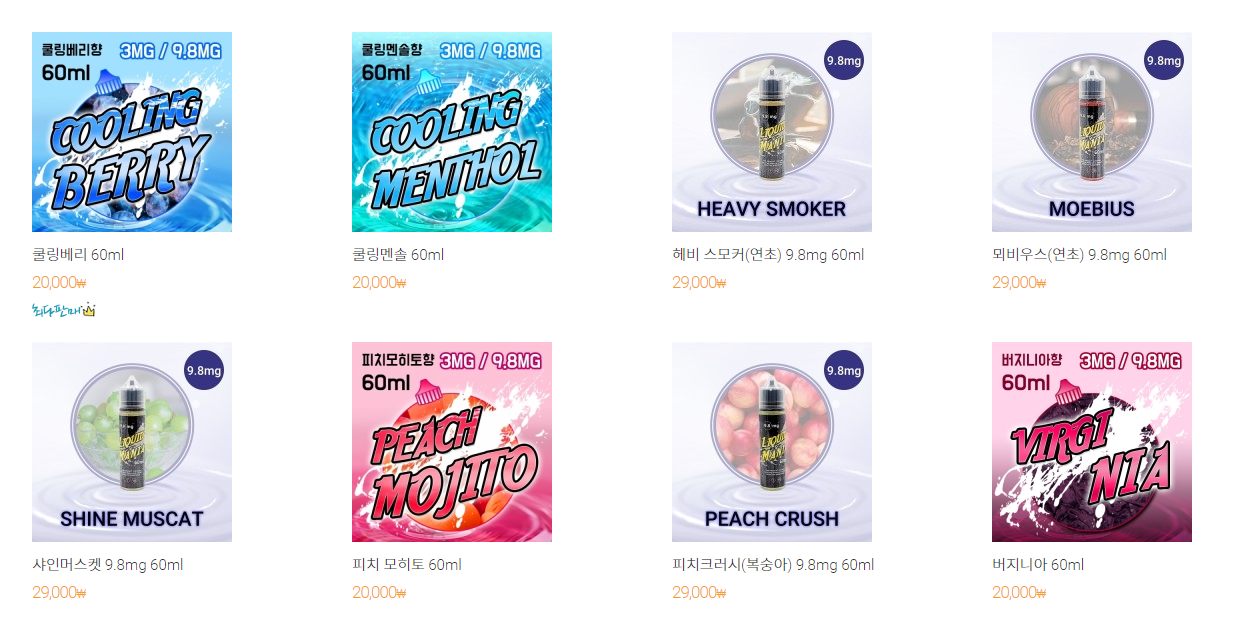 저희 액상은 다양한 맛은 다양하게 판매하고 있어서 고객님 편하게 좋아하실 액상을 구매할 수 있습니다. 그중에 잘 팔리는 액상은 연초 계열이랑 쿨링 계열입니다.