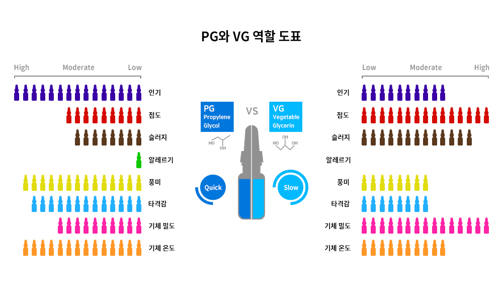 기본적으로 전자담배 액상은 PG, VG, 니코틴으로 구성되어있습니다.