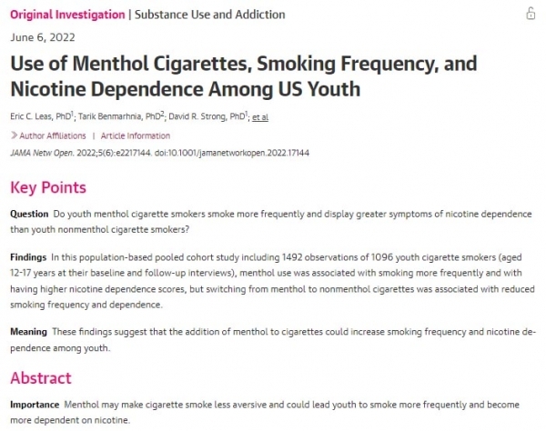 지난 6일 미국 의학저널 '자마 네트워크 오픈(JAMA Network Open)'에 게재된 연구에 따르면 담배에 멘솔을 첨가하는 것이 청소년의 흡연 빈도와 니코틴 의존도를 증가시키고 있음을 시사한다고 밝히고 있다. 멘솔 담배는 금연을 향한 진전을 더 어렵게 만들고 있으며, 연구자들은 FDA가 제안한 멘솔 향료 금지를 강력하게 지지한다고 밝혔다.